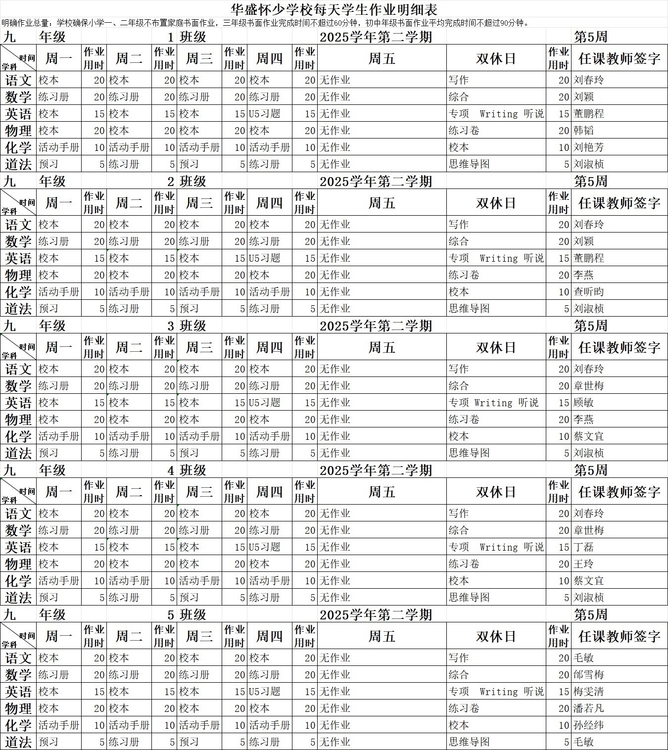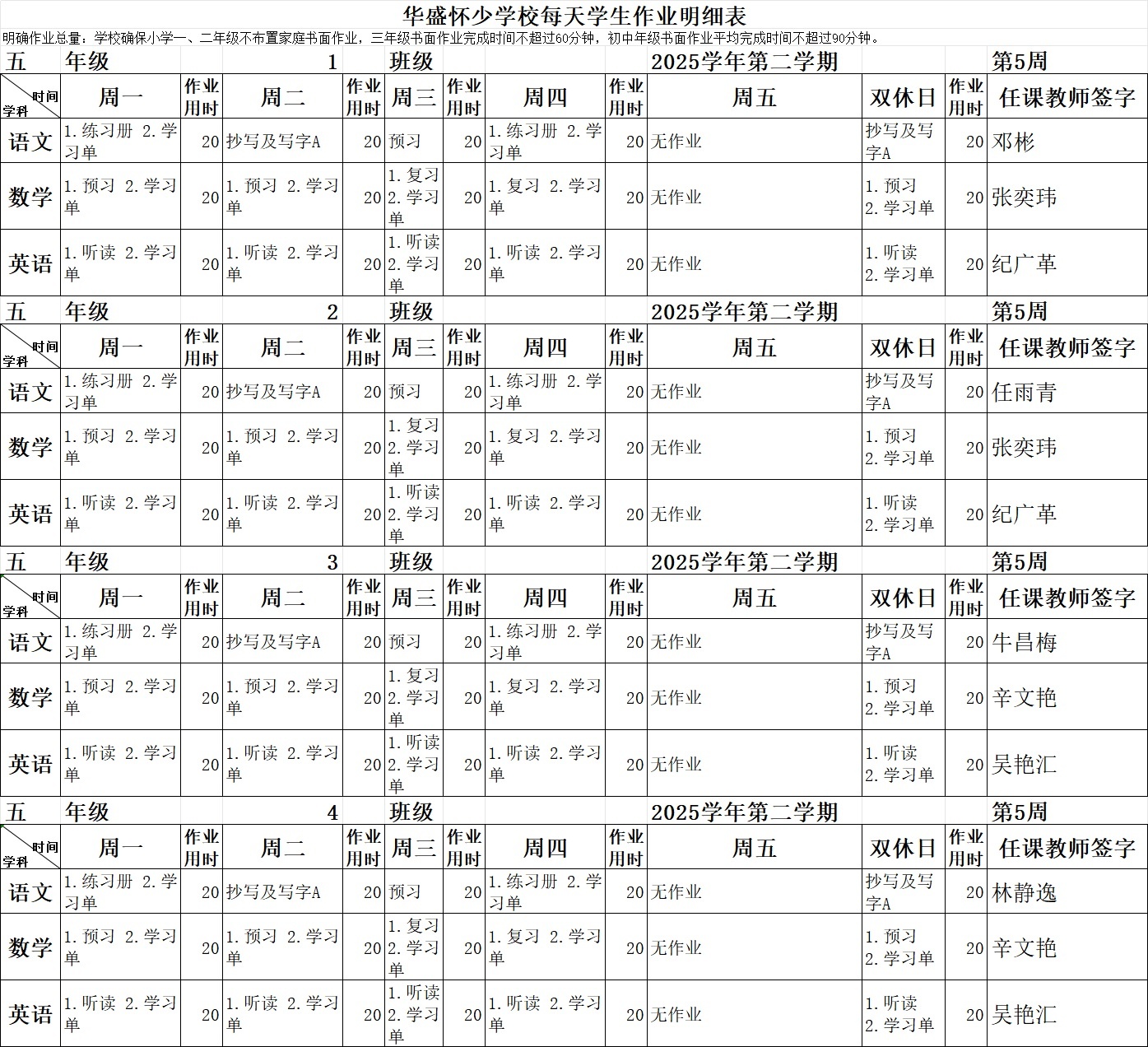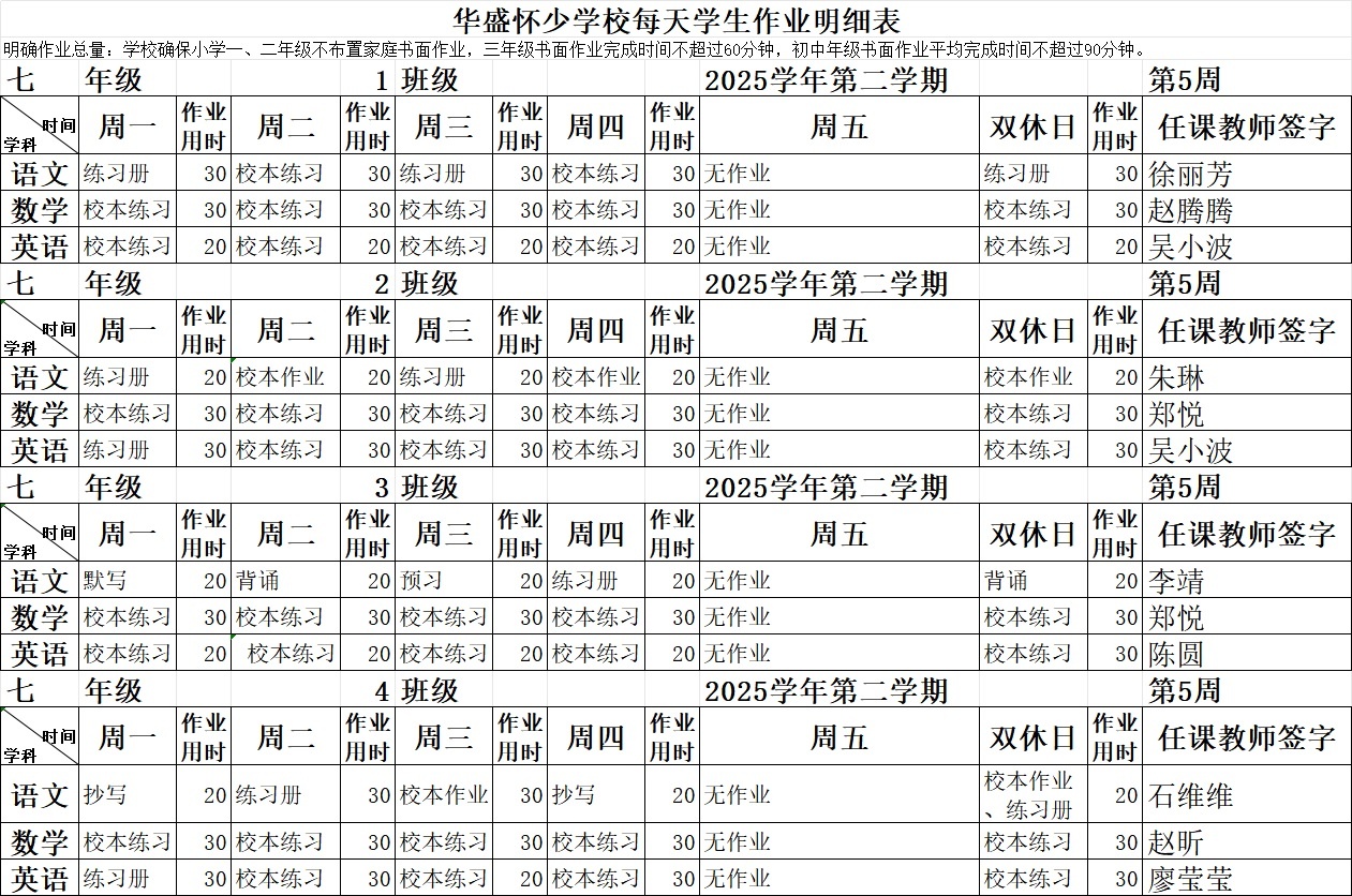 2025学年第二学期第5周作业公示
