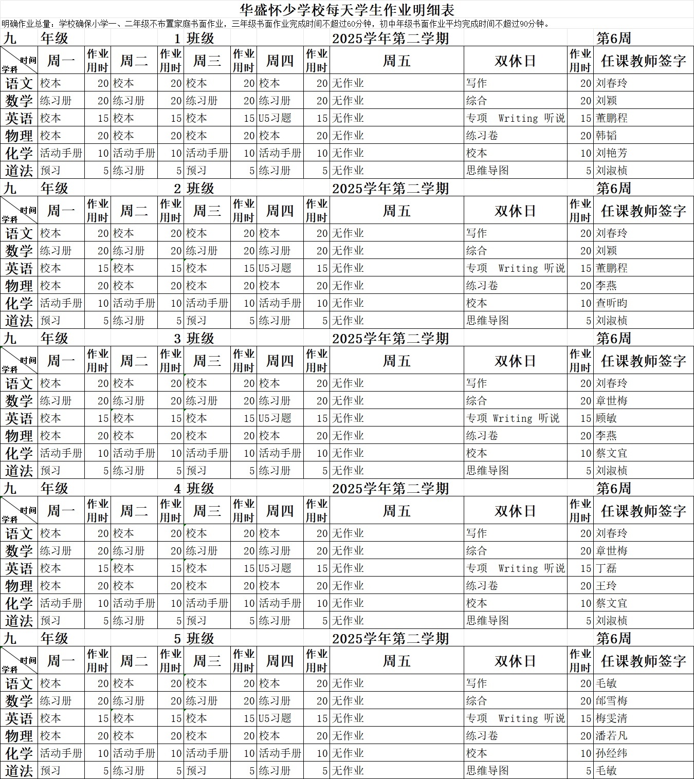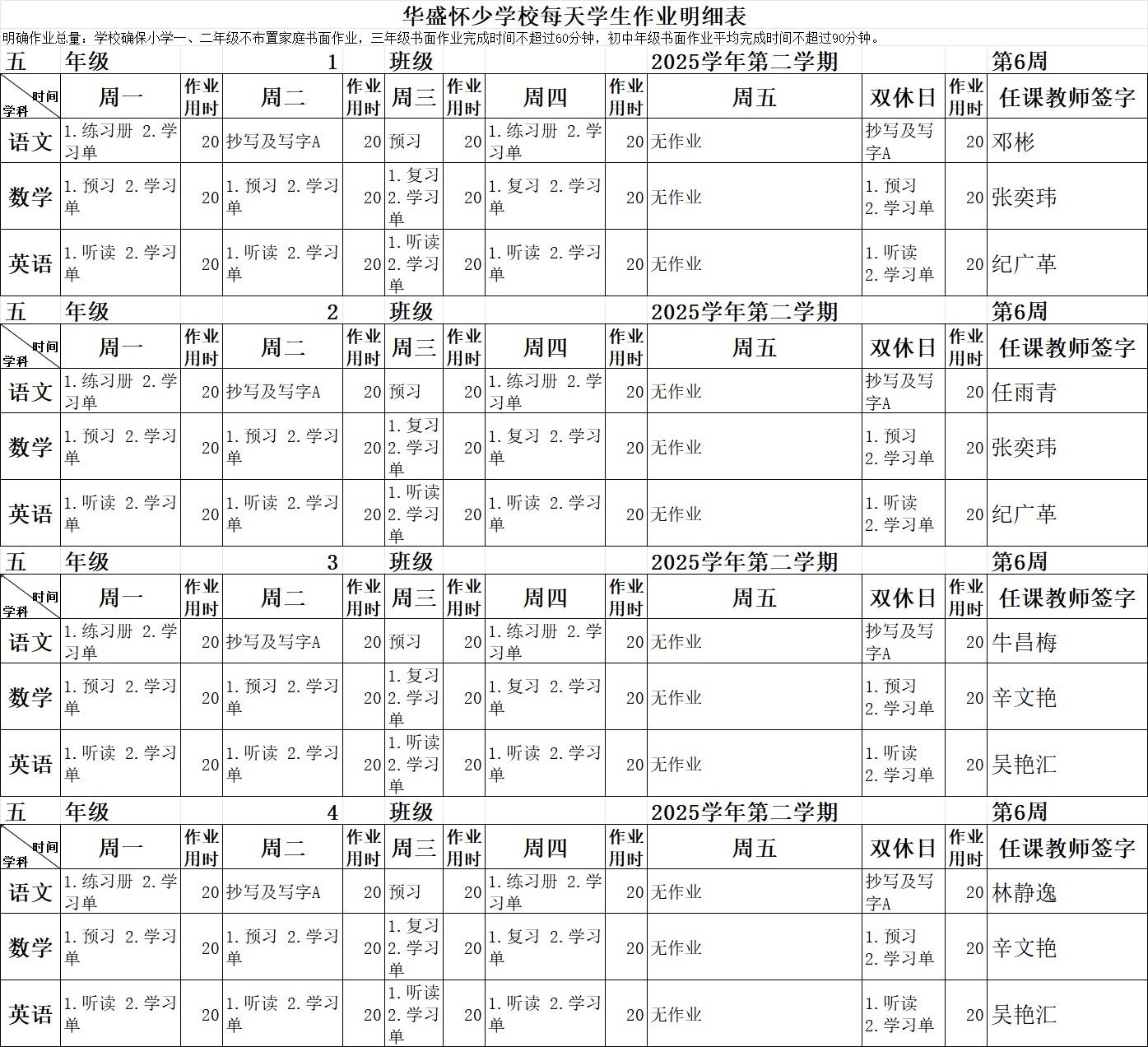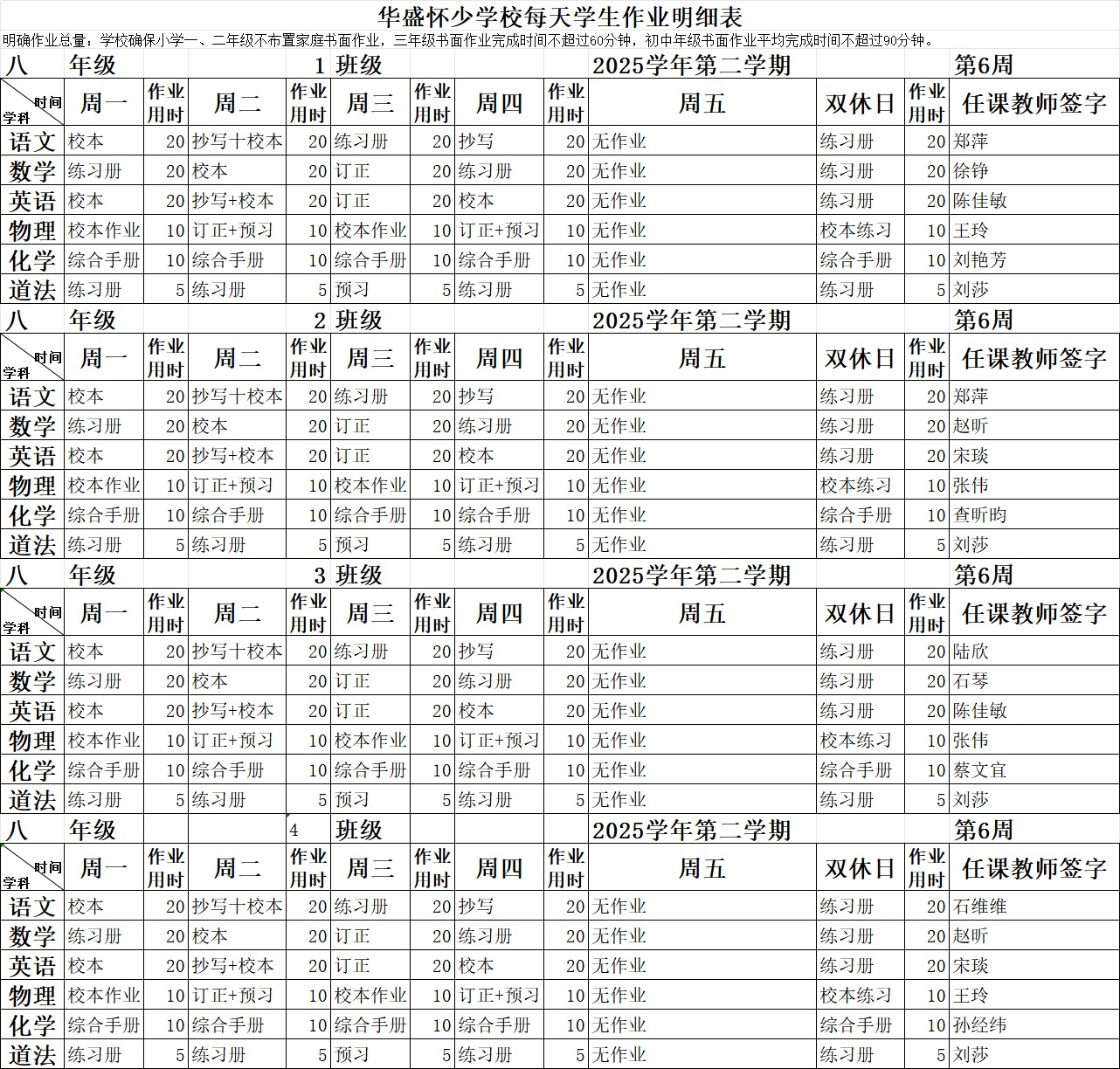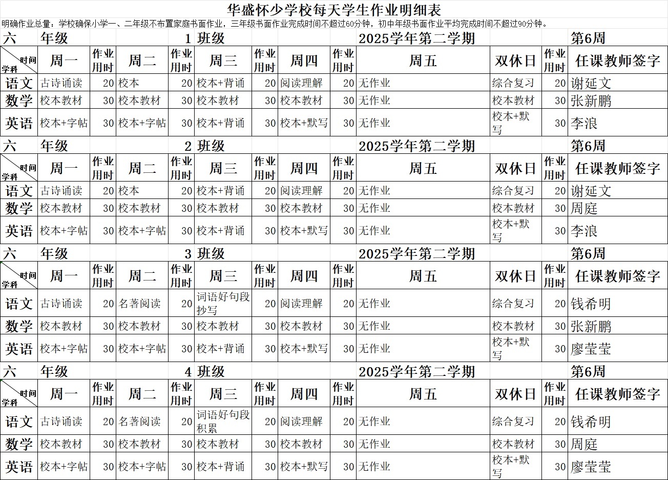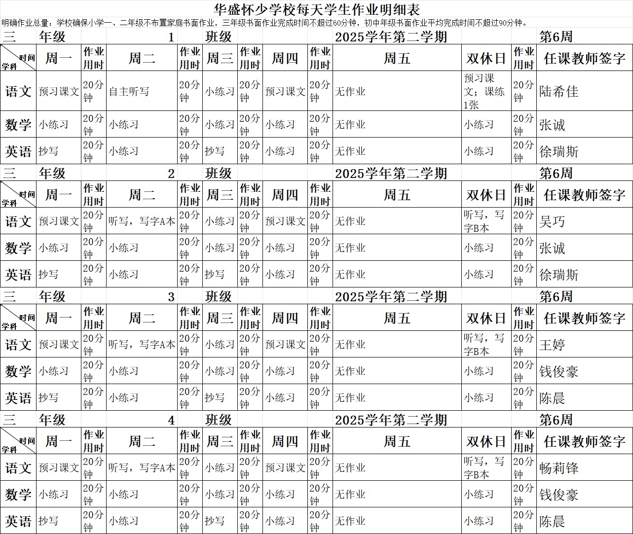 2025学年第二学期第6周作业公示