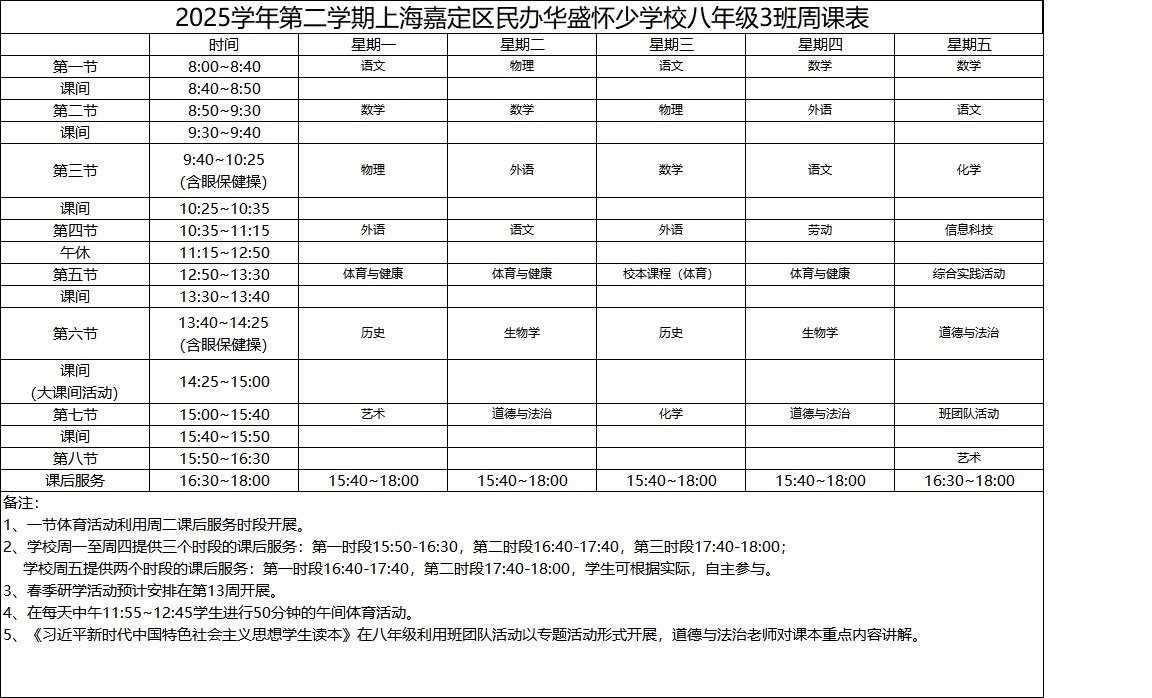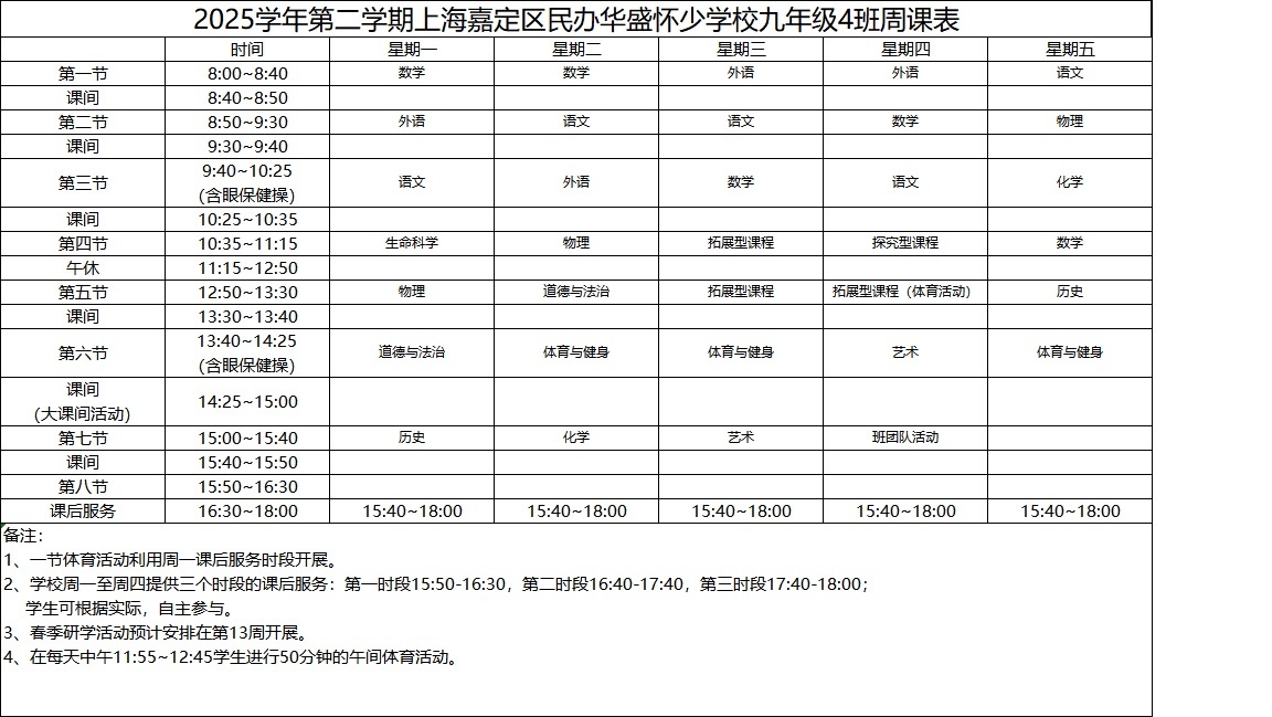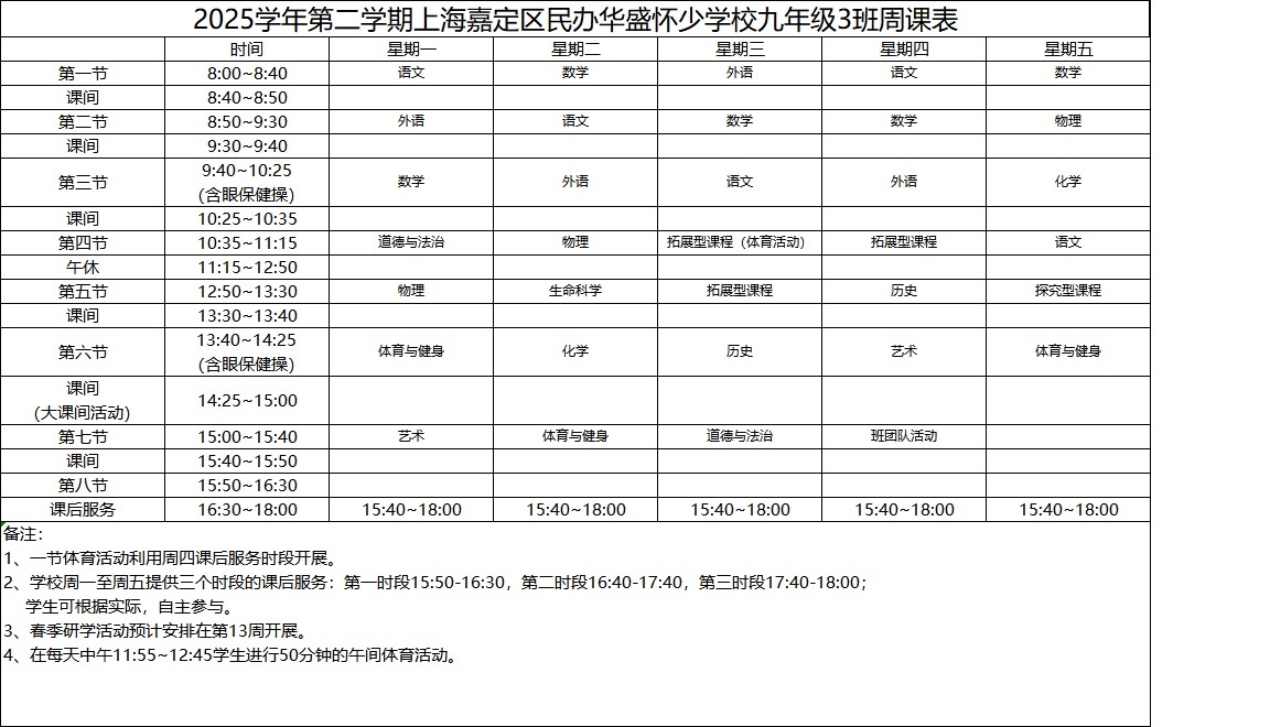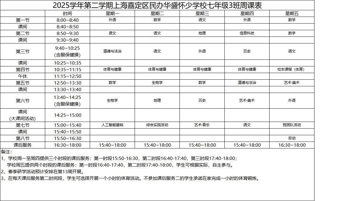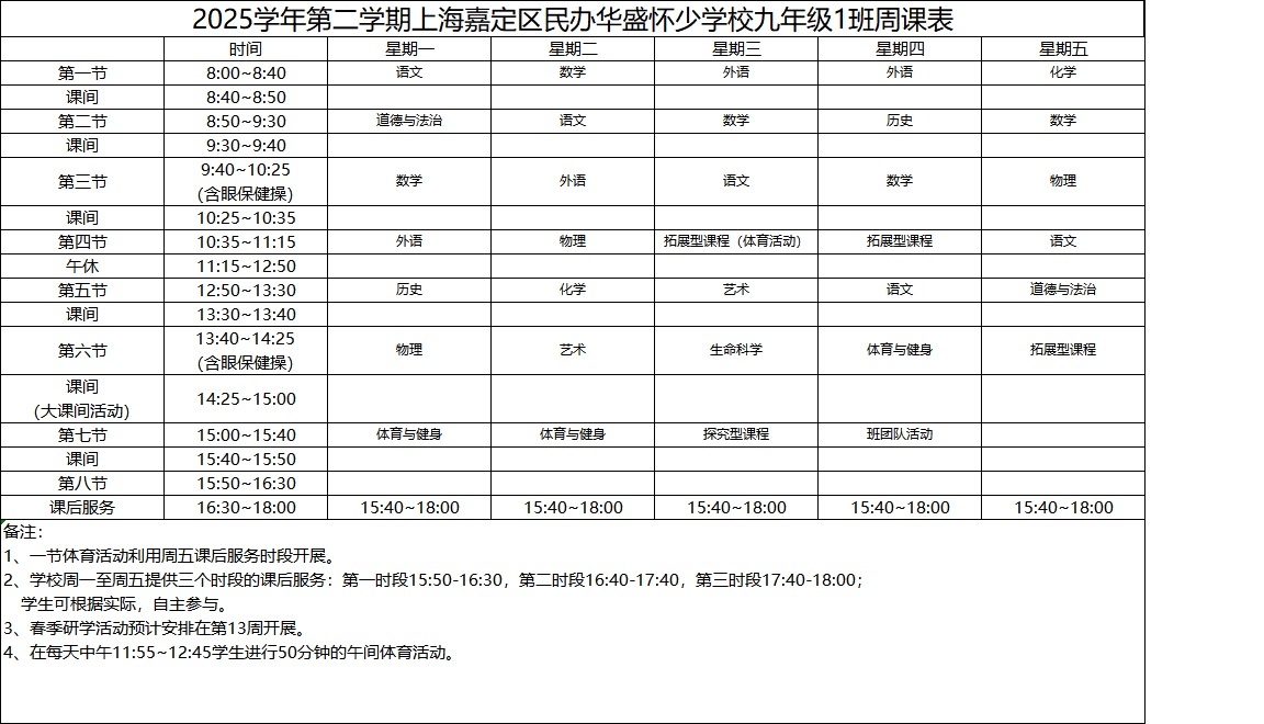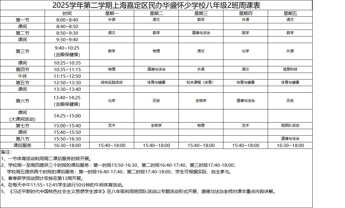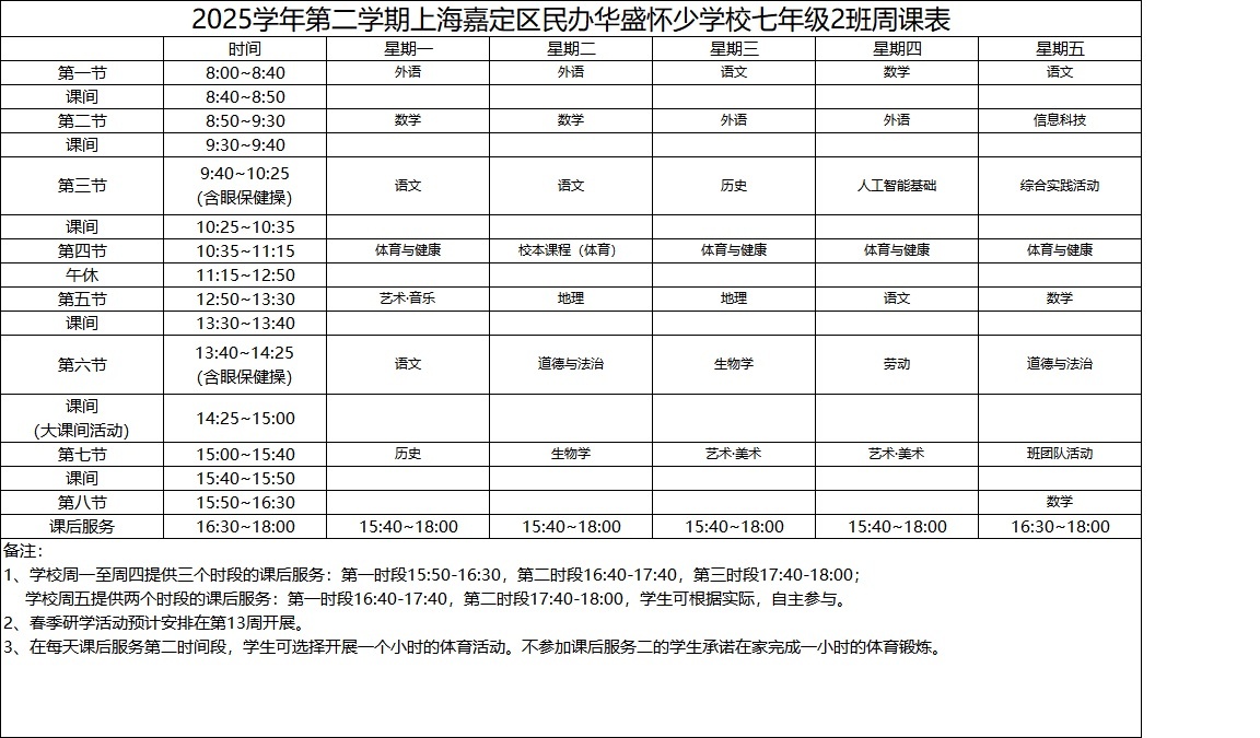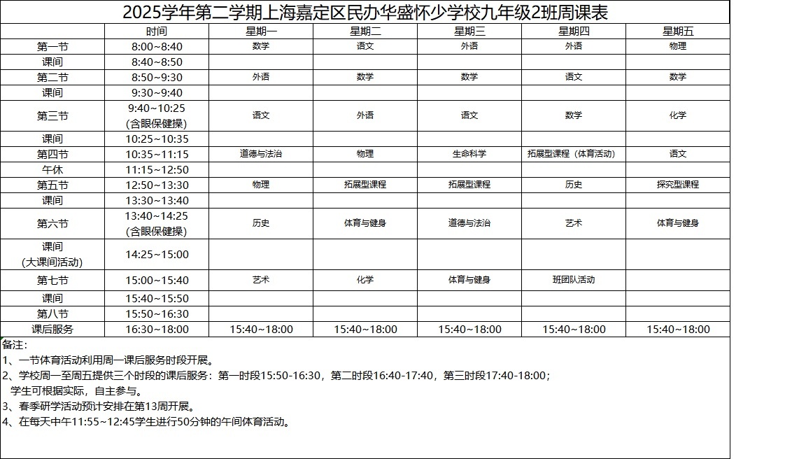 2025学年第二学期上海嘉定区民办华盛怀少学校初中部周课表