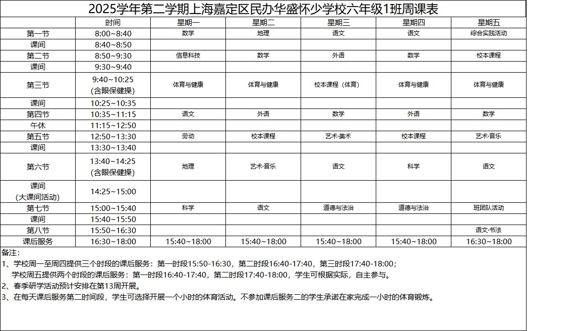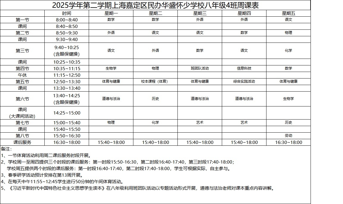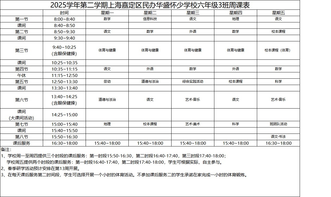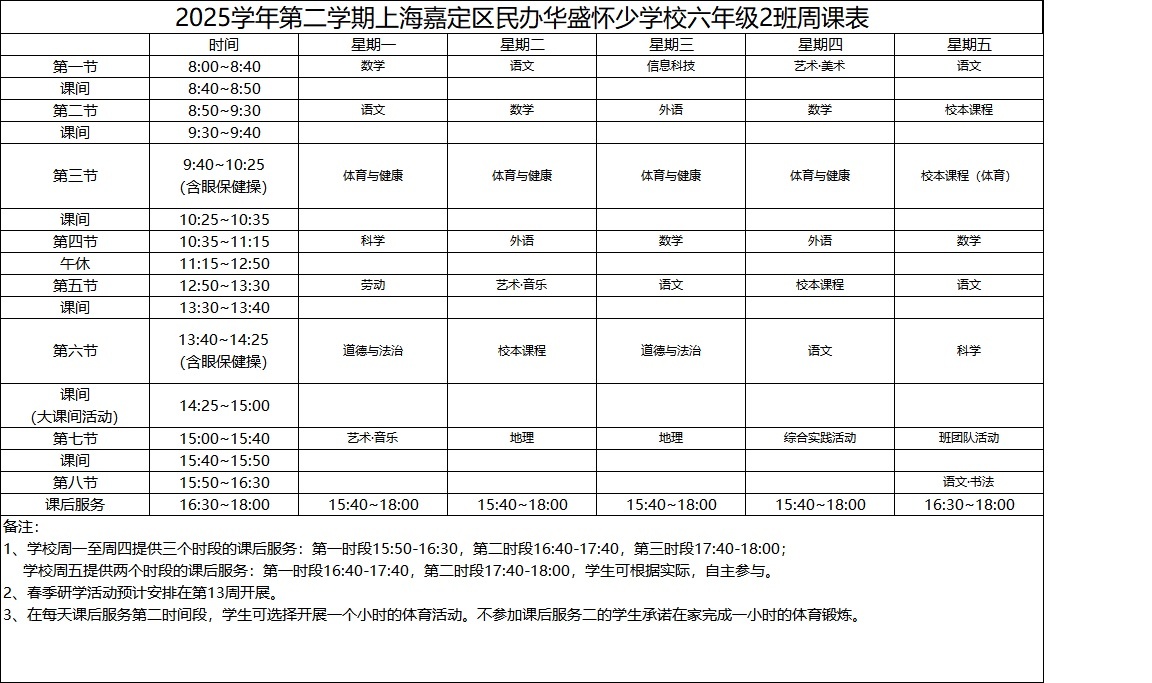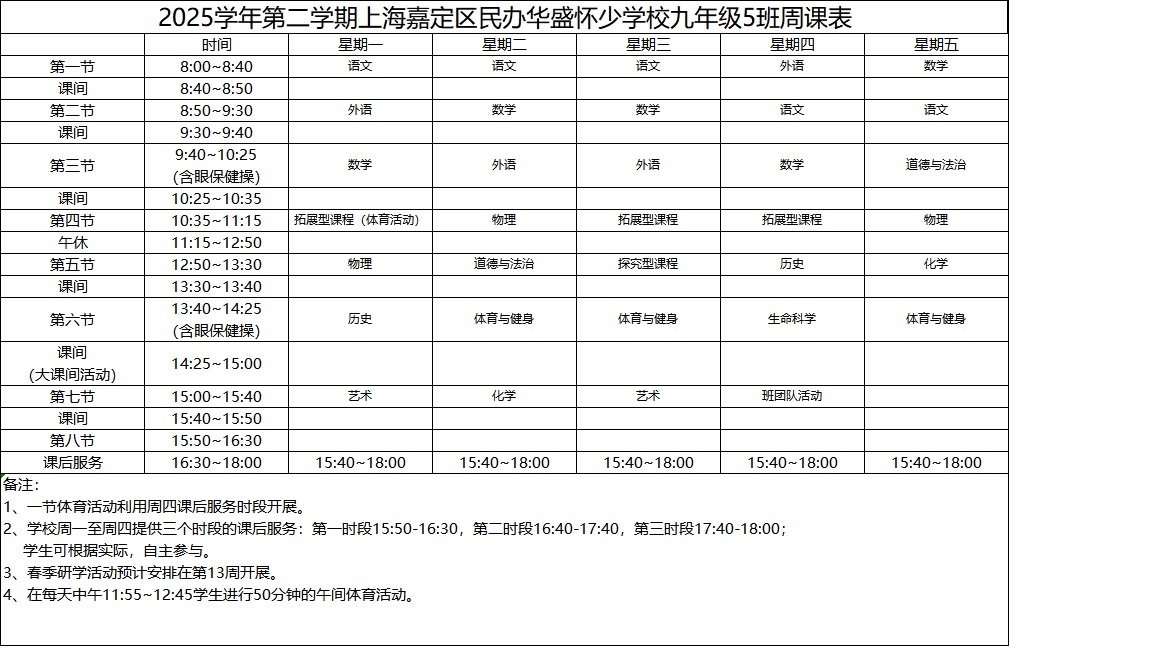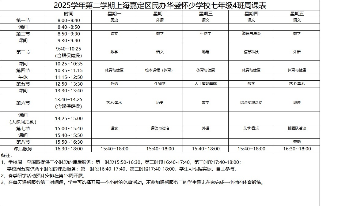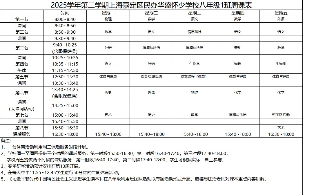 2025学年第二学期上海嘉定区民办华盛怀少学校初中部周课表