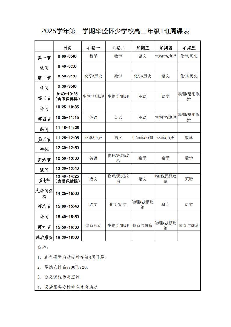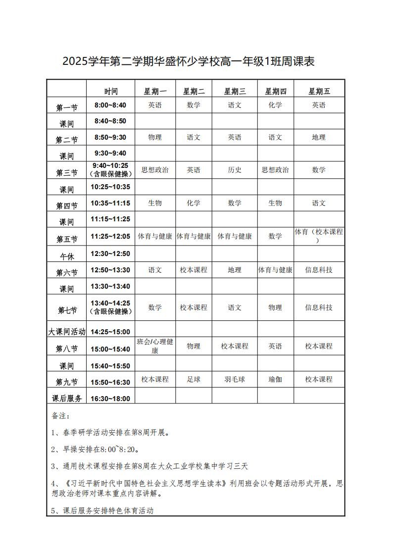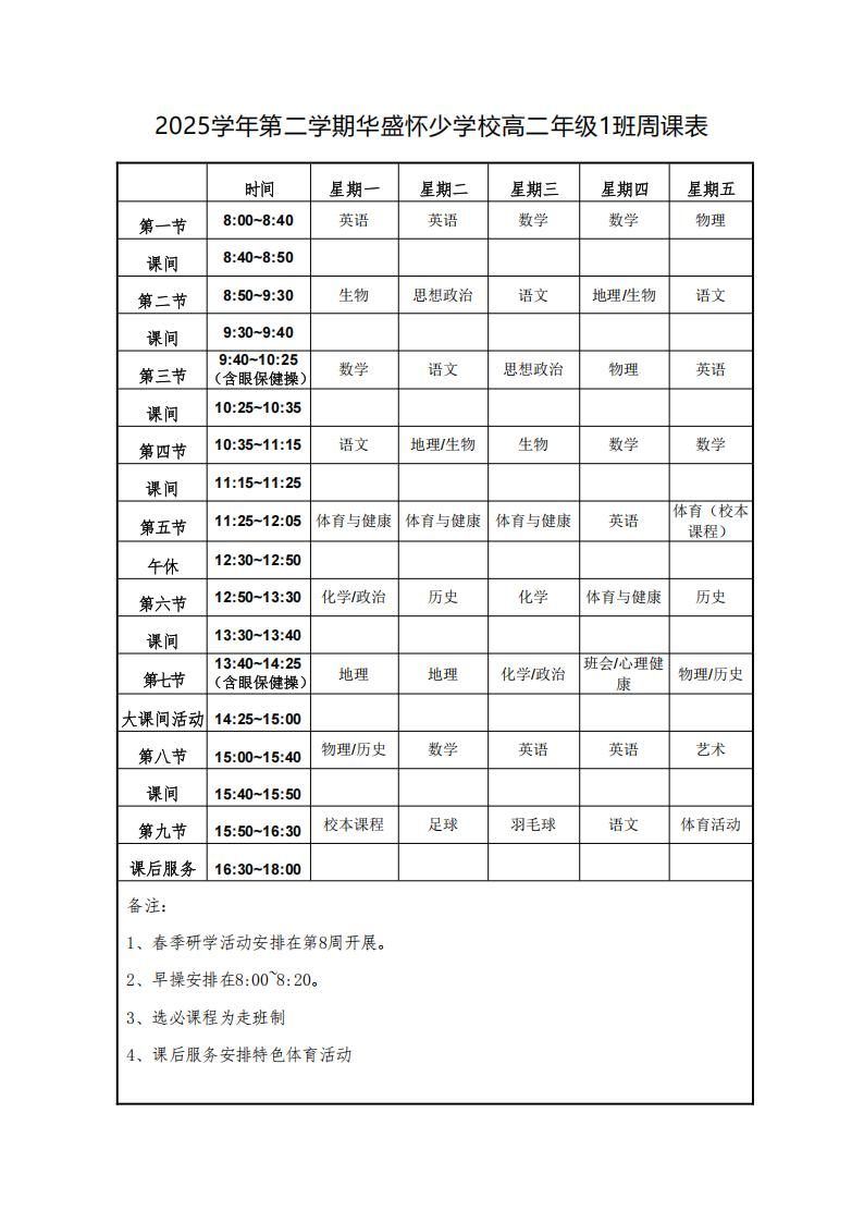 2025学年第二学期上海嘉定区民办华盛怀少学校高中部周课表